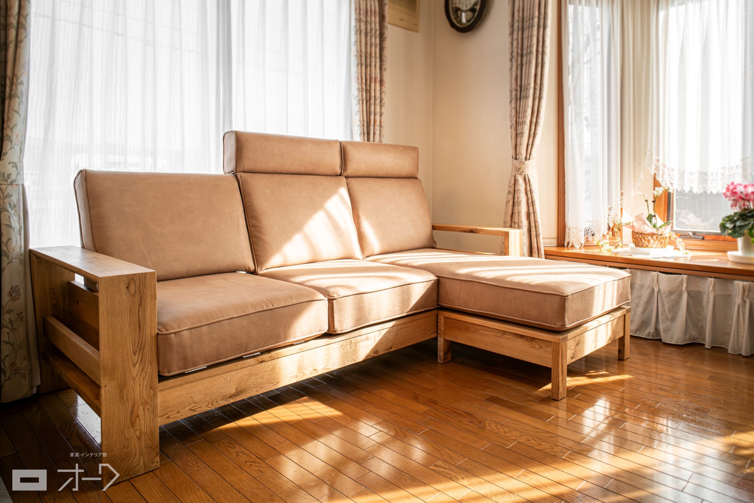 リビングスペースには、ナラ(オーク)無垢材のソファをお選びいただきました。幅広の無垢材をふんだんに使用したフレームは存在感があります。肘掛けにはお飲み物を置いたり、下部のポケットにリモコンや雑誌などが収納できる機能的な設計も人気の一台です。