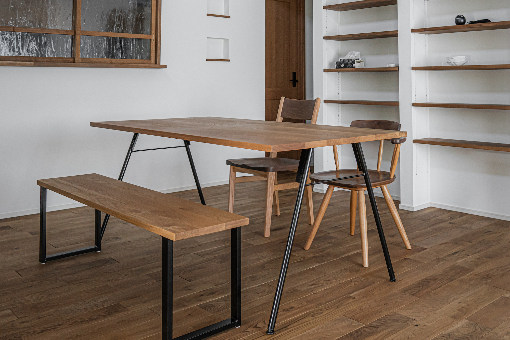 ナラ(オーク)無垢材のダイニングセットをお届けしました。厚みを抑えた天板に細身のスチール脚が良く似合います。椅子はブラックウォールナットを用いたツートンカラーのタイプをお選びいただき、質感高く賑やかな印象に仕上がりました。