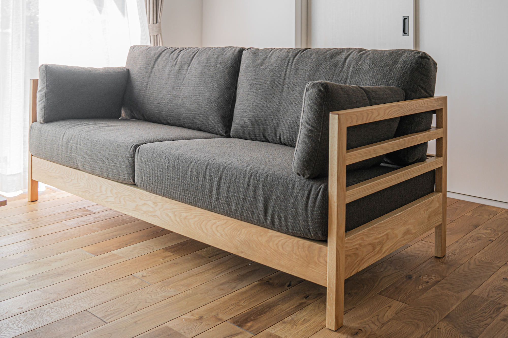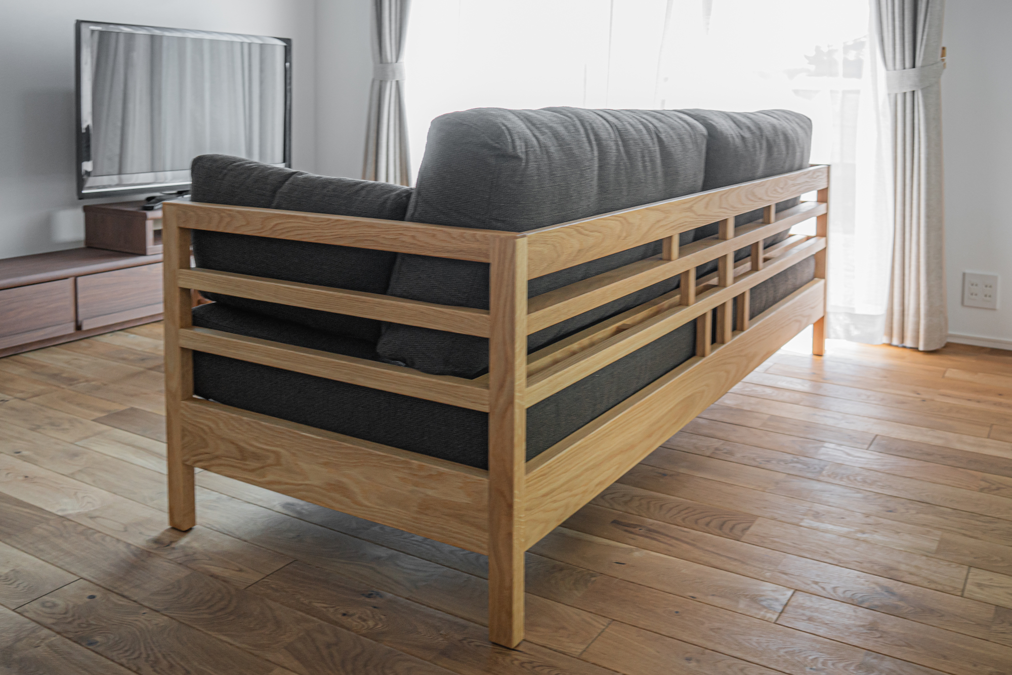 リビングスペースにも、ナラ(オーク)無垢材のソファをお選びいただきました。カバーは落ち着いたブラウンでシックにまとまっています。フレームは側面と背面のデザインが特にこだわりの一品。細身のパーツを用いながらも、触れるとガッシリとした手触りが得られる優れたデザインです。