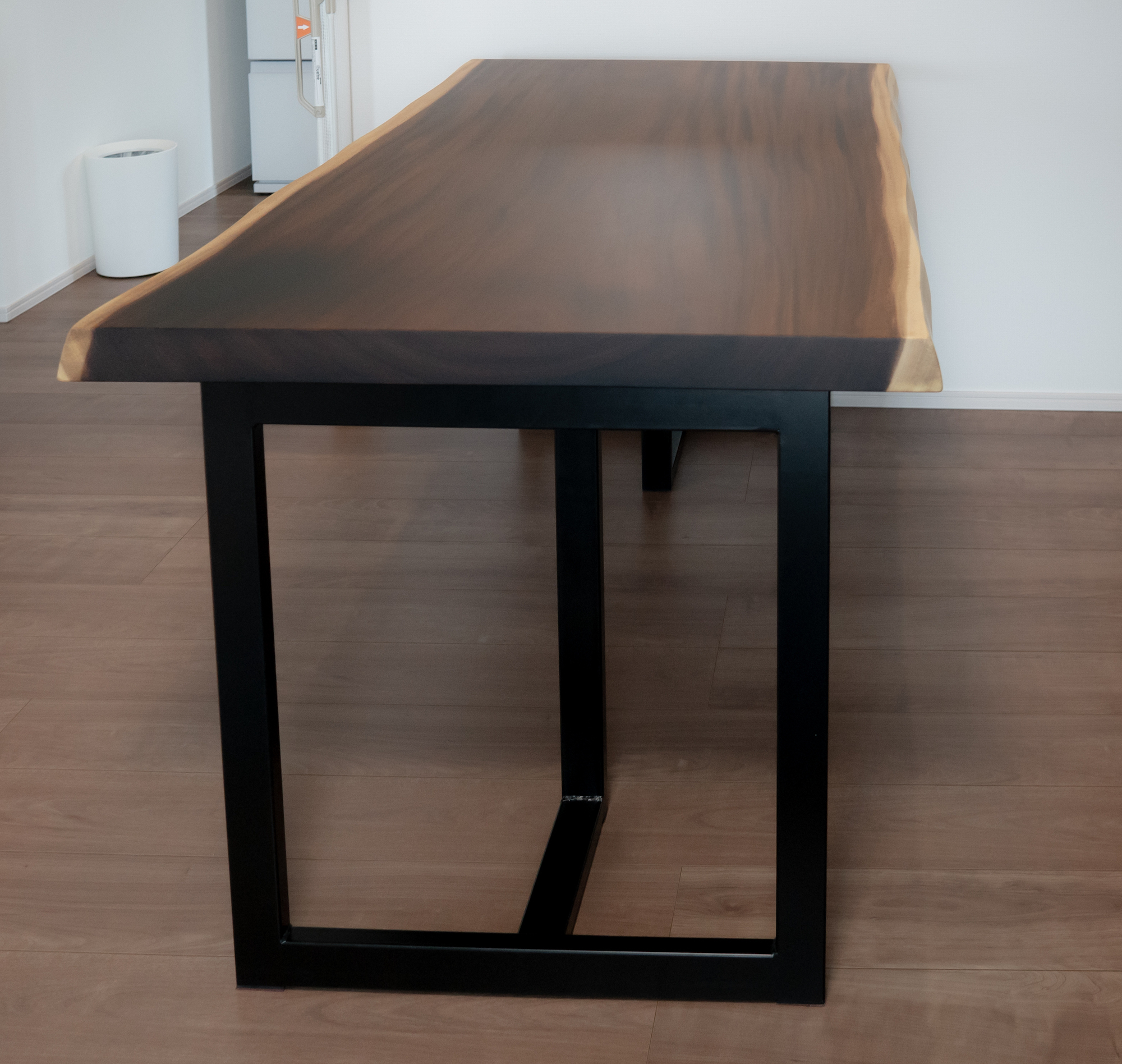 モンキーポッド無垢材のダイニングテーブルをお届けしました。濃淡のある特徴的な木目が人気のモンキーポッドにスチール脚を合わせて、一枚板らしい迫力を味わえる組み合わせに仕上がっています。