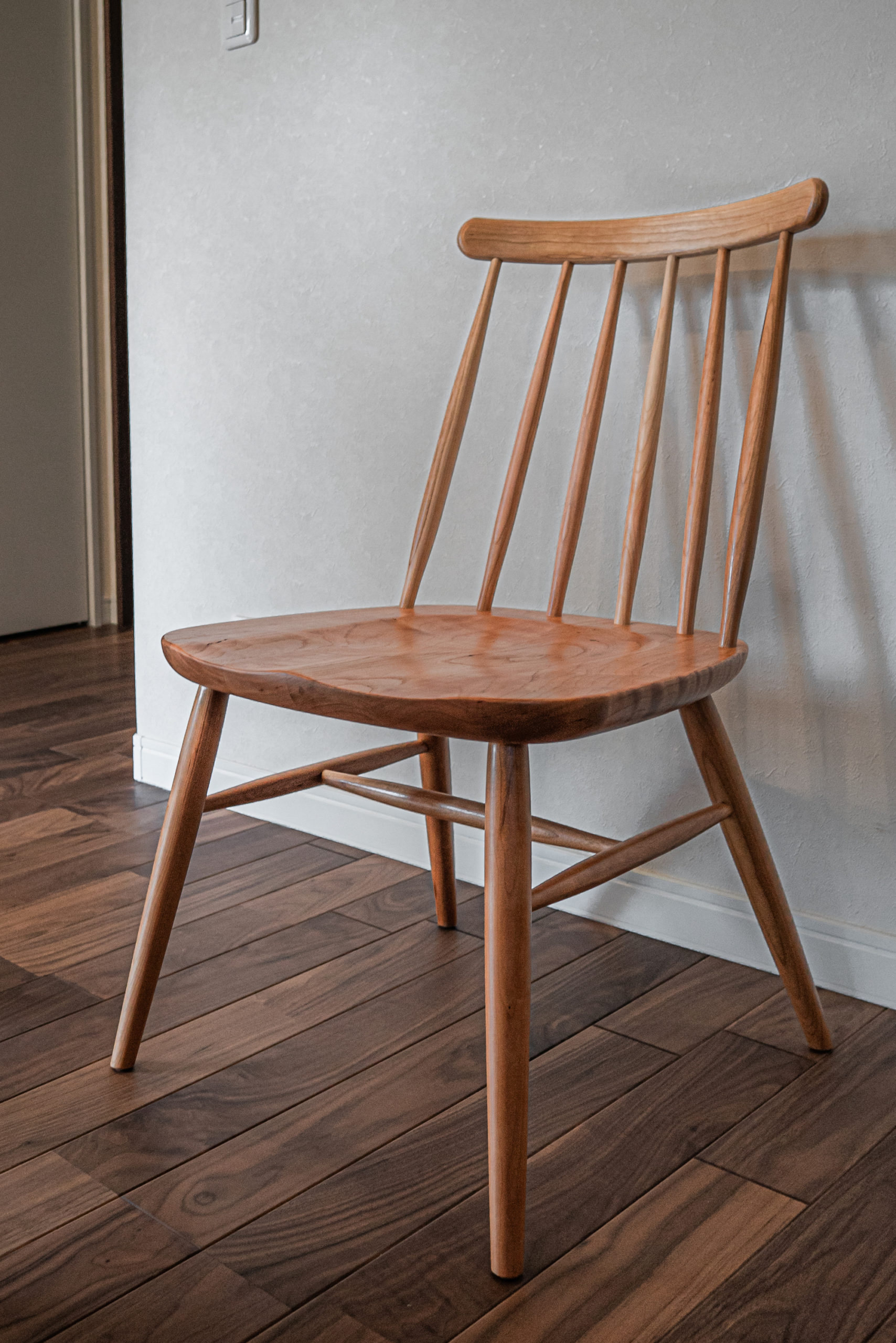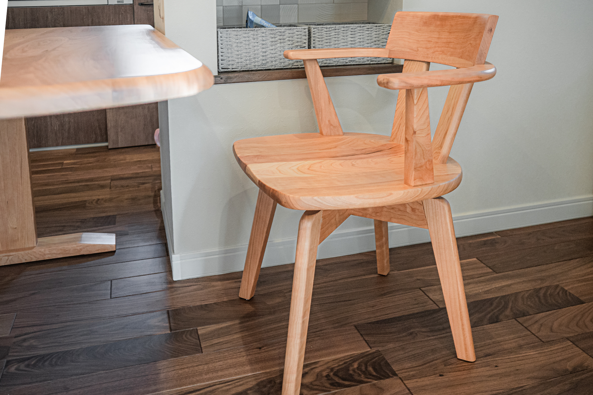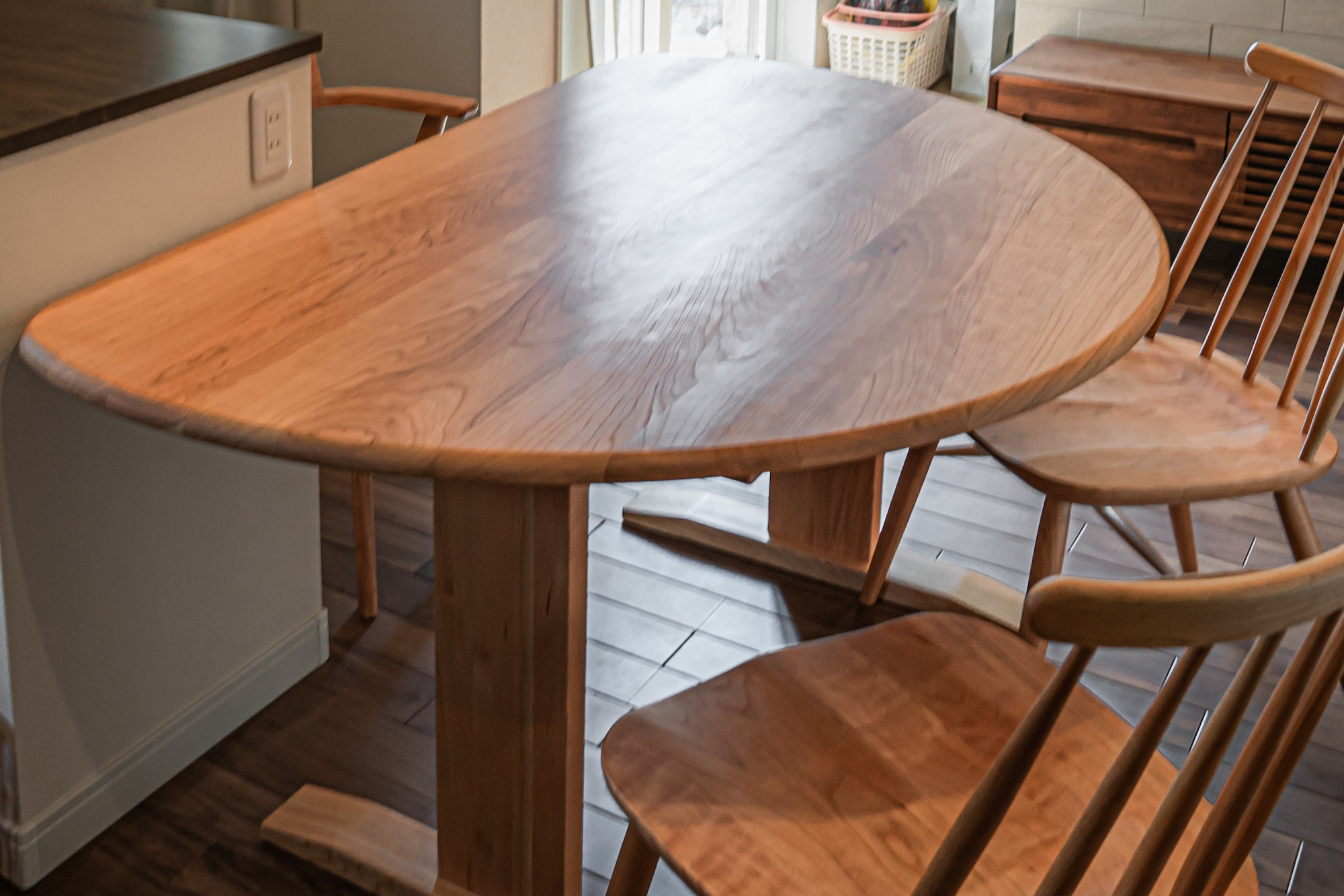 ブラックチェリー無垢材のダイニングセットをお届けしました。無垢材ならではの柔らかい形状の変形テーブルは、コンパクトな設計ながら意外と大人数が座れる優れもの。椅子もブラックチェリーで統一しつつ、ご家族それぞれの使い勝手に合わせたデザインでお選びいただきました。