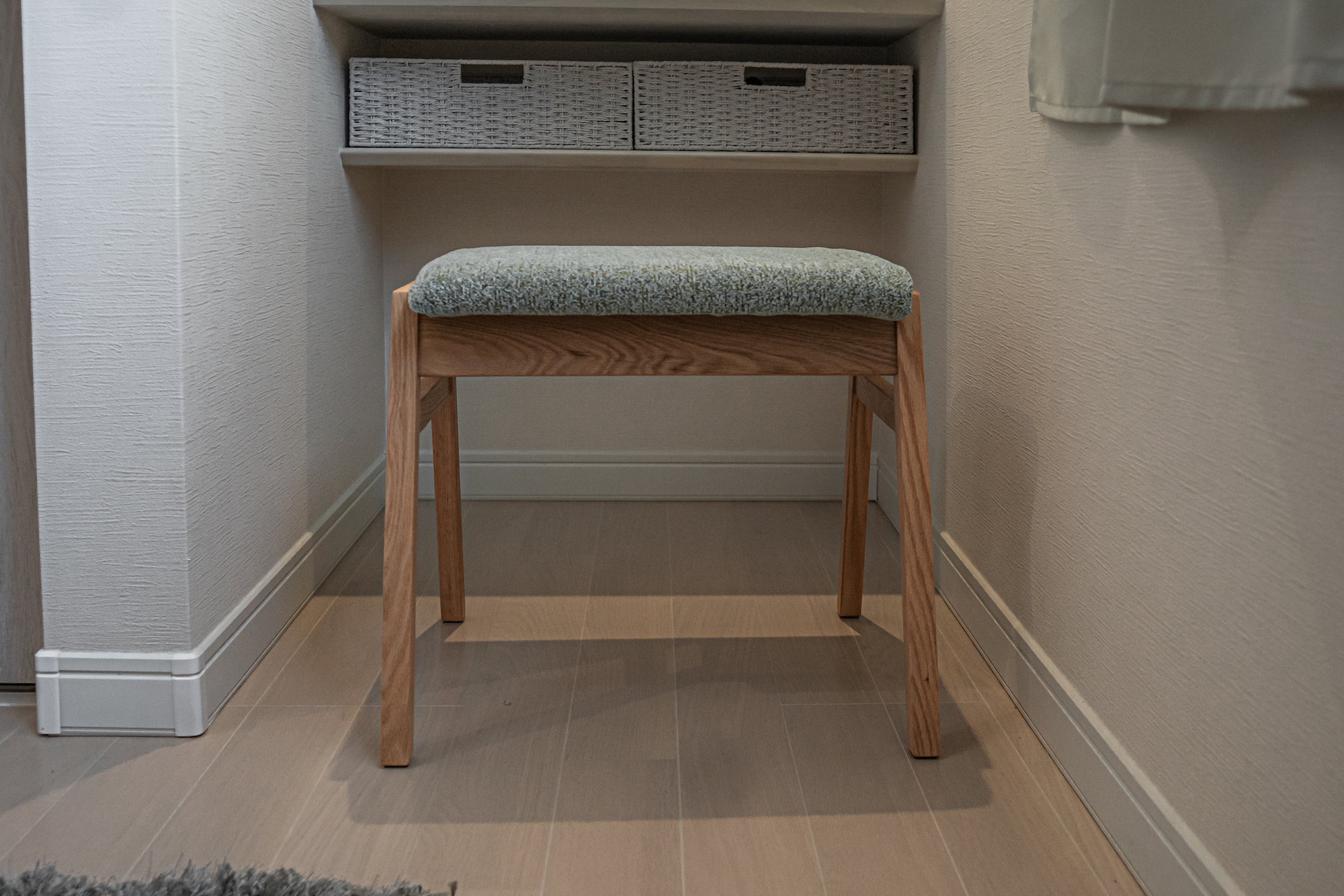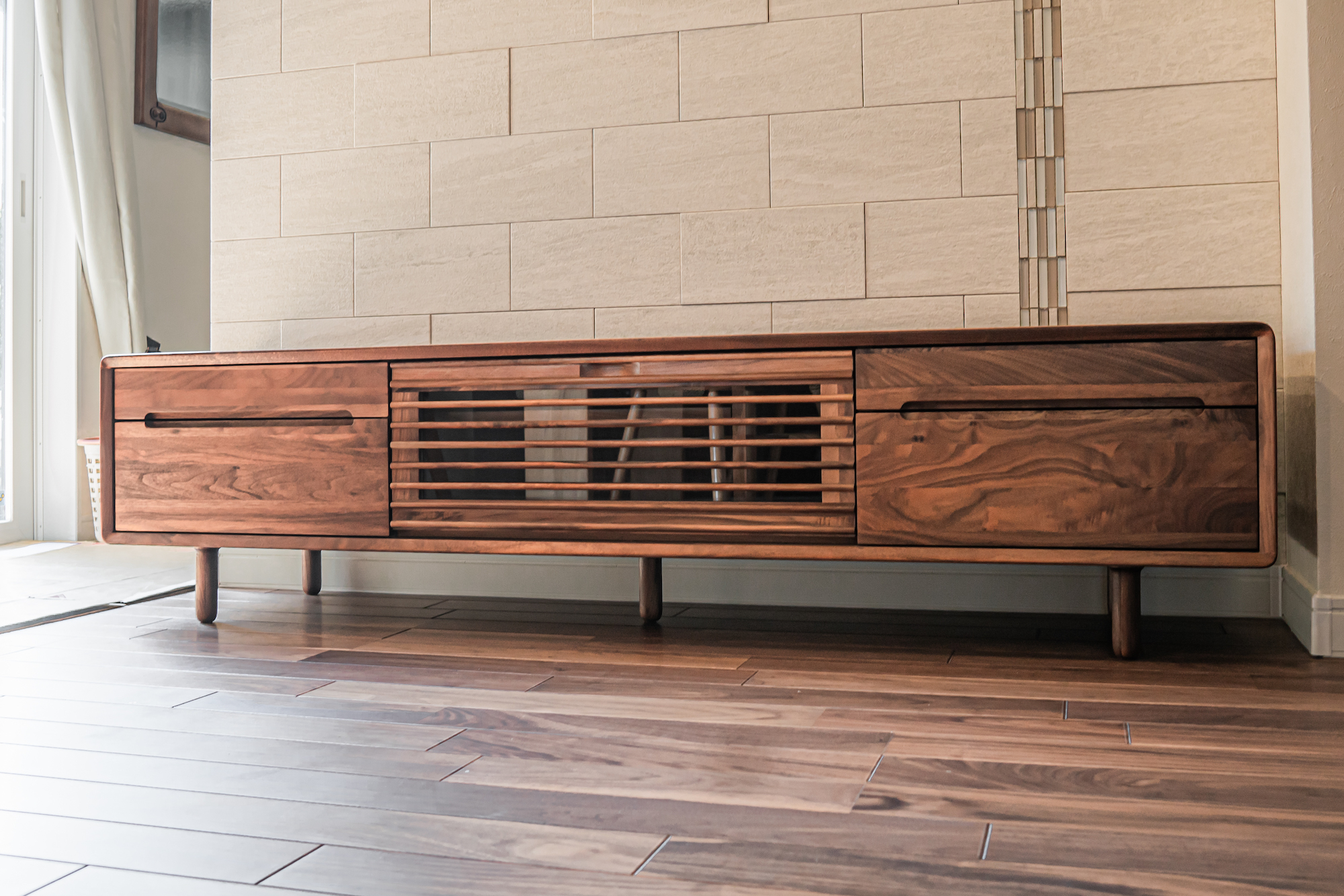 テレビボードにはブラックウォールナット無垢材をお選びいただきました。デッキスペースの前面に施された、手の込んだ横桟が目を引きます。個室には明るい色合いのスツールも合わせてお選びいただき、リビングダイニングとはまた違った印象のお部屋に華を添えています。