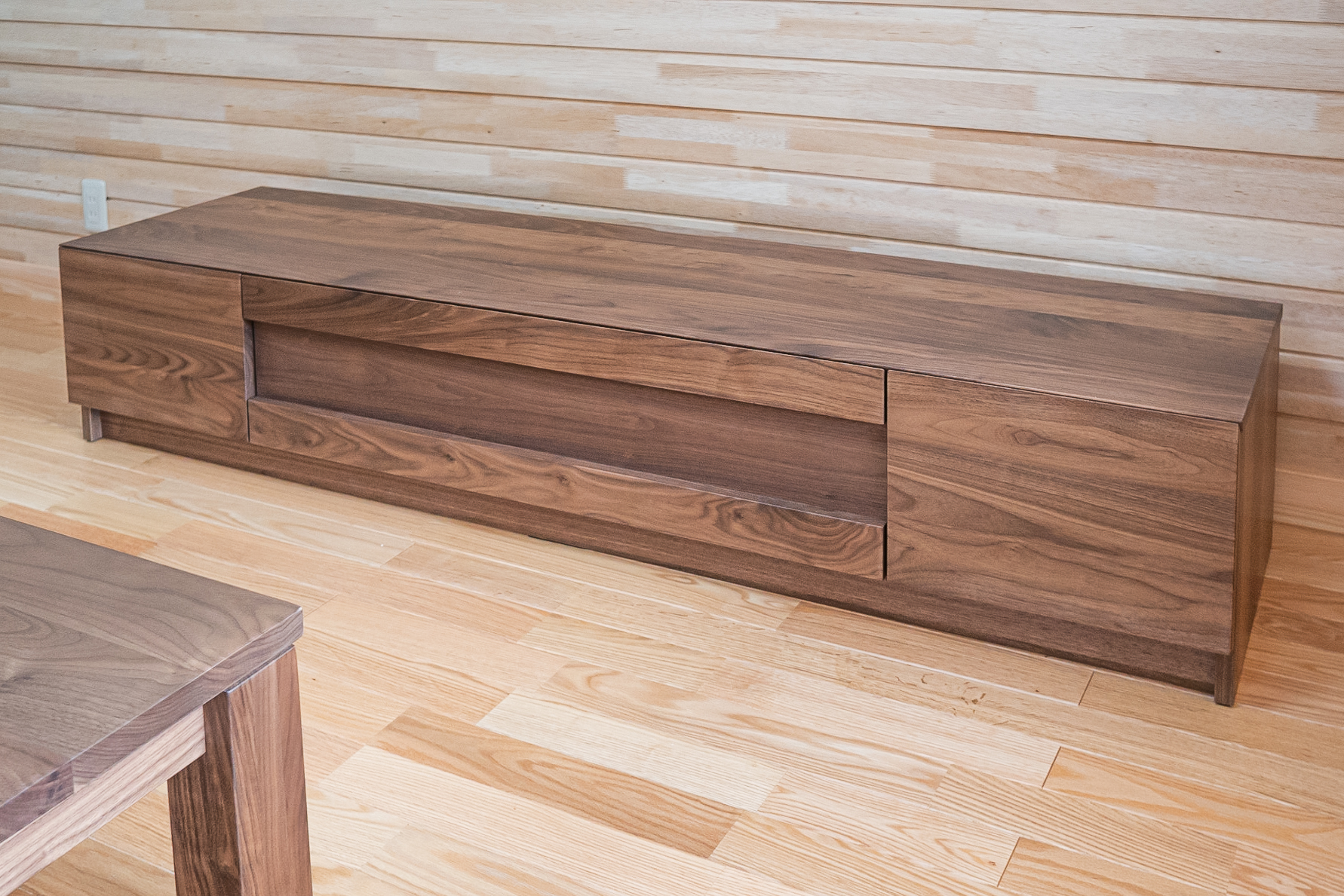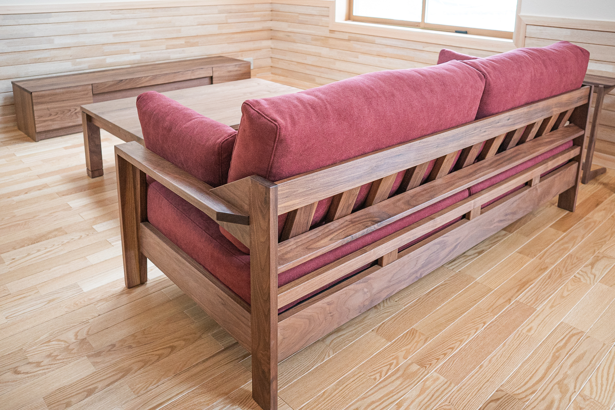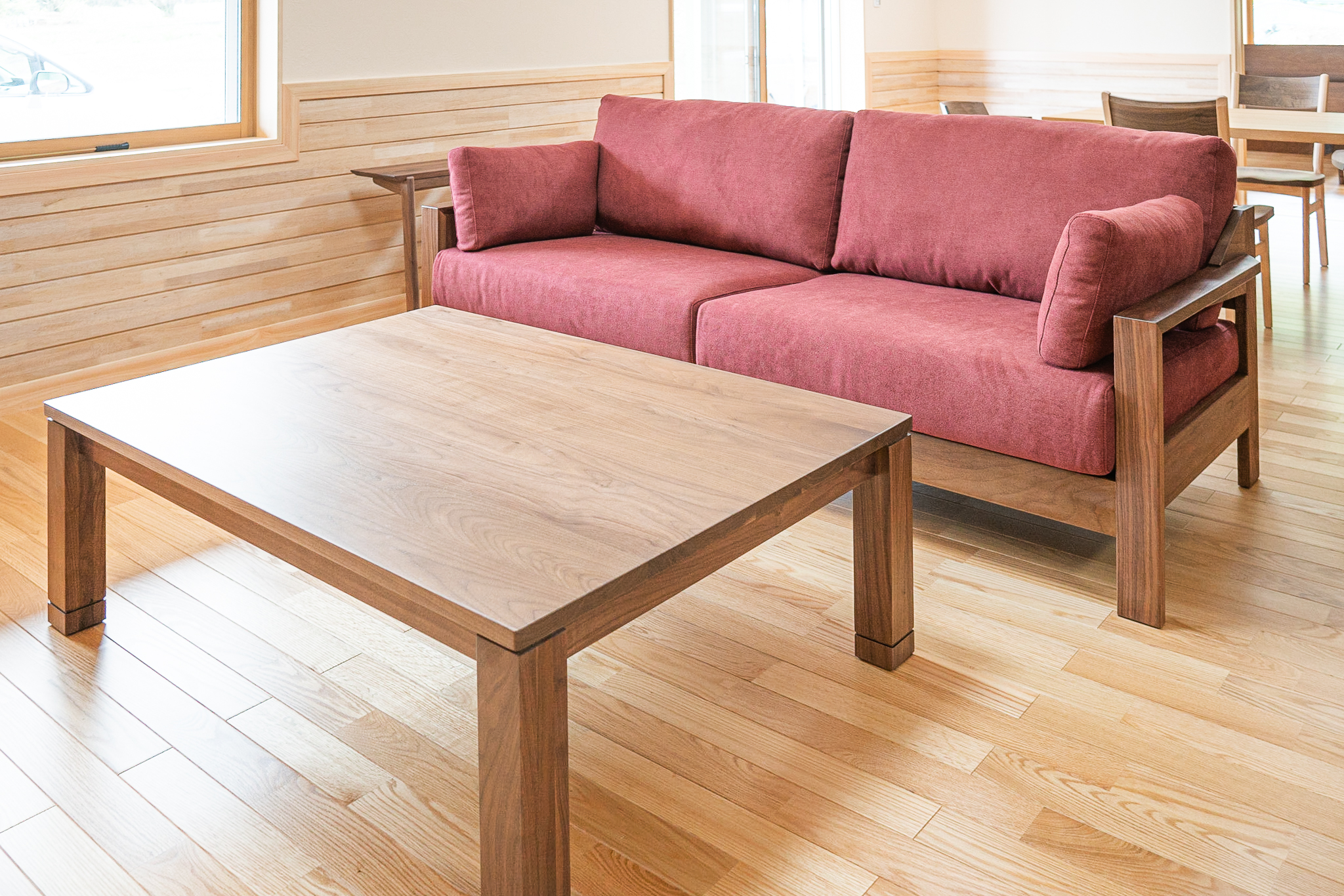 リビングスペースには、ブラックウォールナット無垢材のソファ・こたつ・テレビボードをお選びいただきました。無垢材のこたつは質感も抜群で、春夏シーズンでもリビングの顔として使い続けることができます。シンプルなデザインのテレビボードとも相性ばっちりですね!ソファの背面も惚れ惚れするような高級感です。