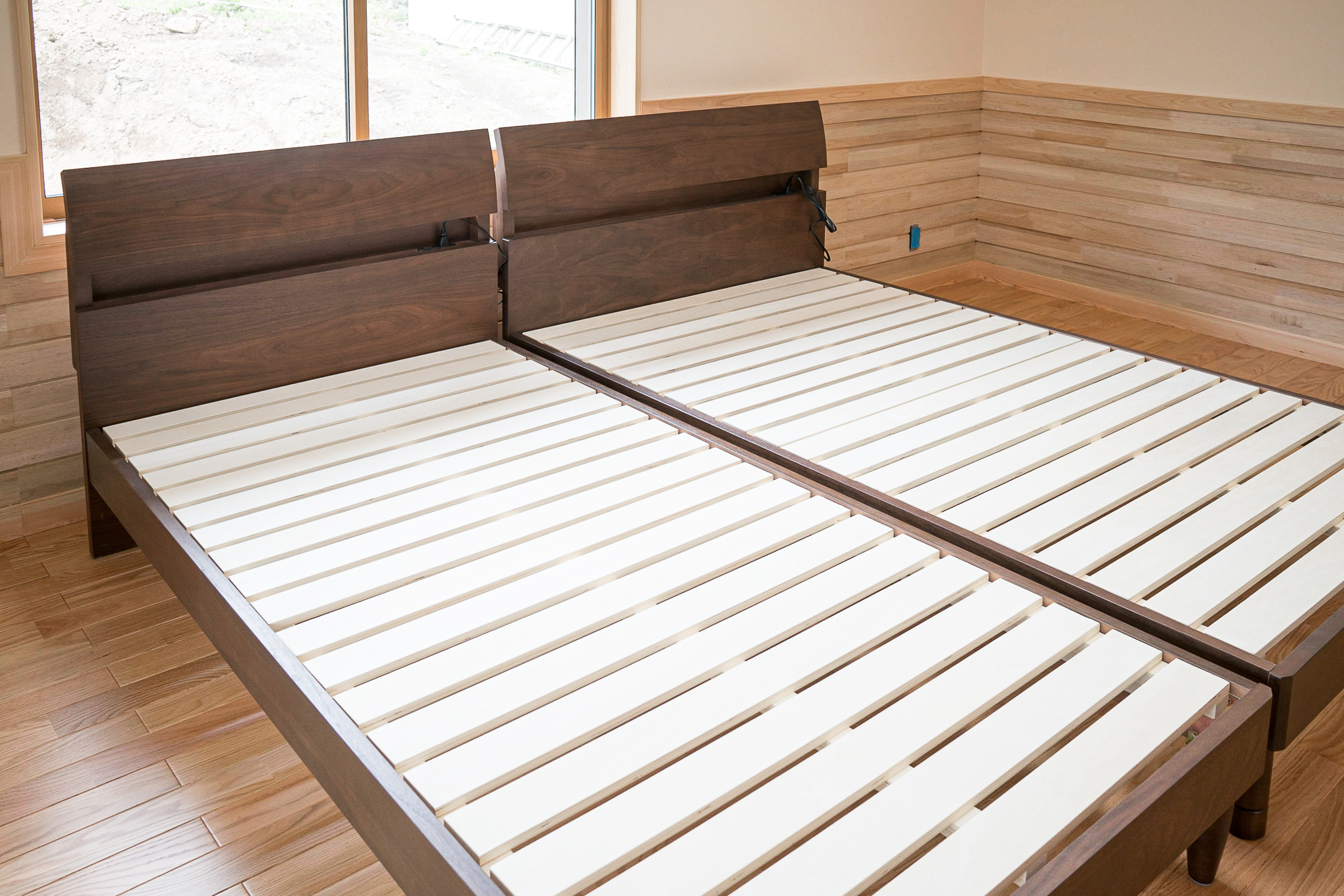寝室のベッドもブラックウォールナット材で揃えていただきました。宮付き&コンセントで実用性もばっちり確保しています。シンプルなデザインで飽きがこないので、長くお使いいただけることと思います。