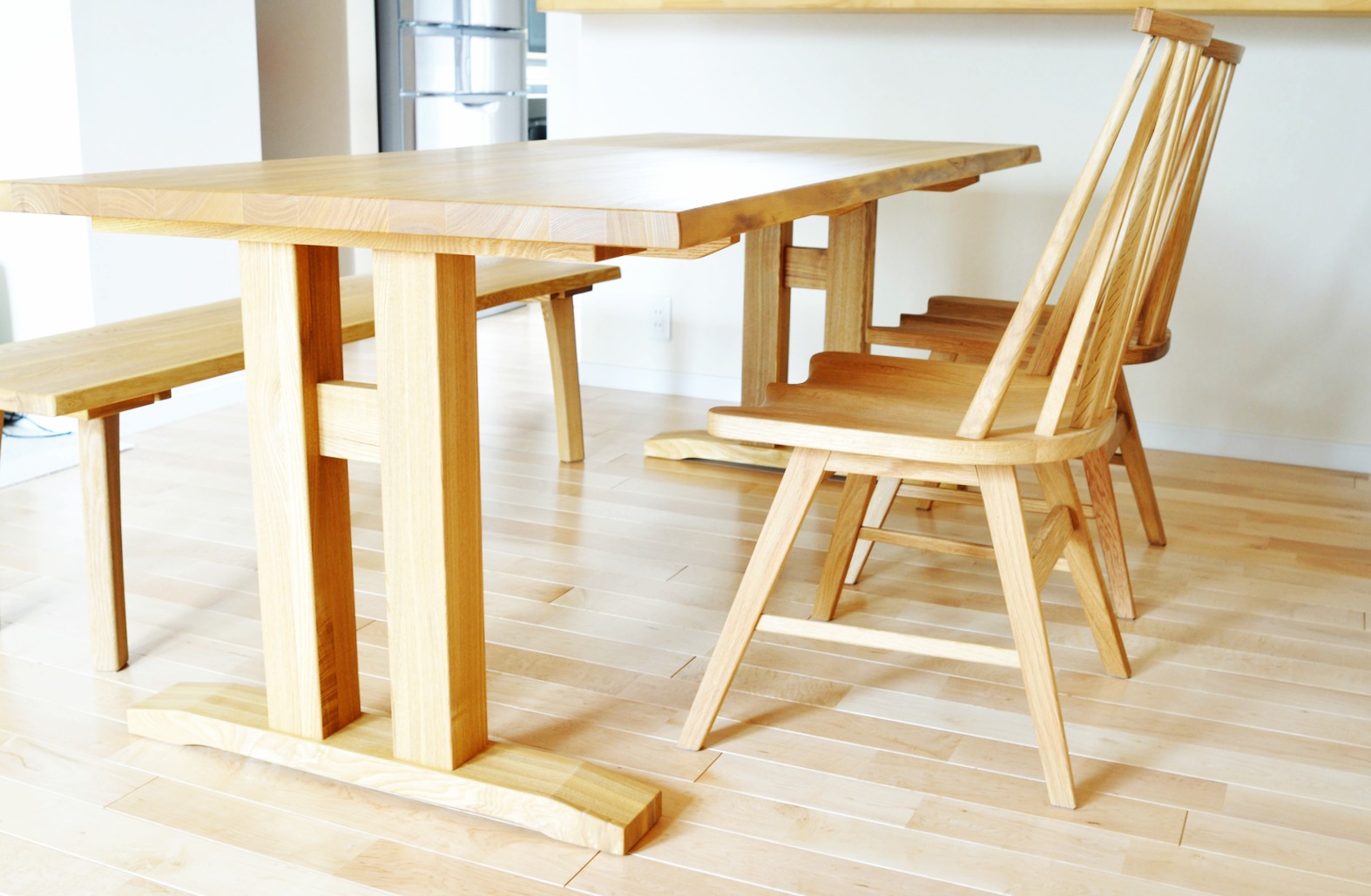 タモ(アッシュ)無垢材のダイニングテーブルとベンチ、ナラ(オーク)無垢材のチェアをお届けしました。