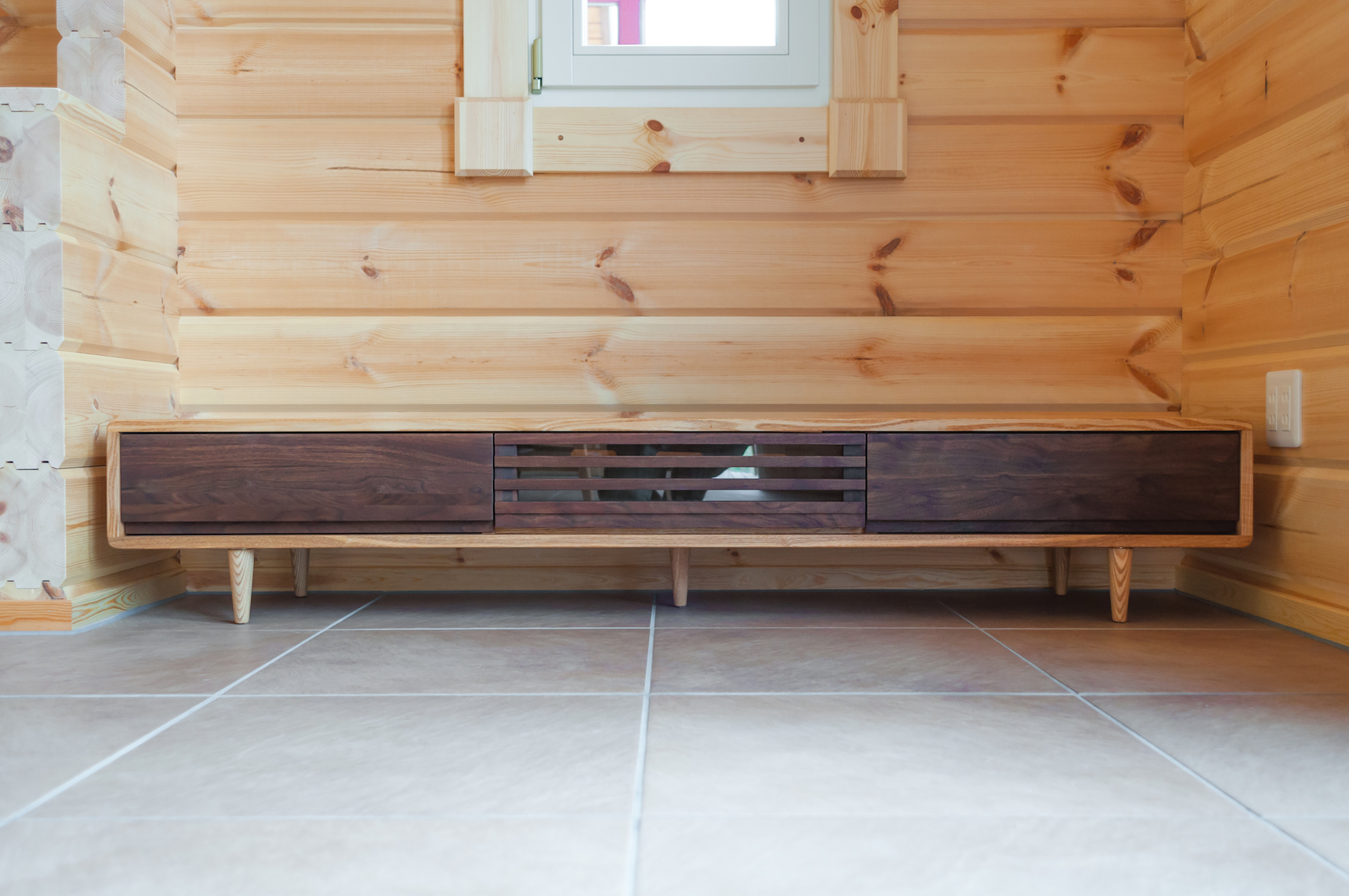 タモ(アッシュ)×ブラックウォールナット無垢材のTVボードです。