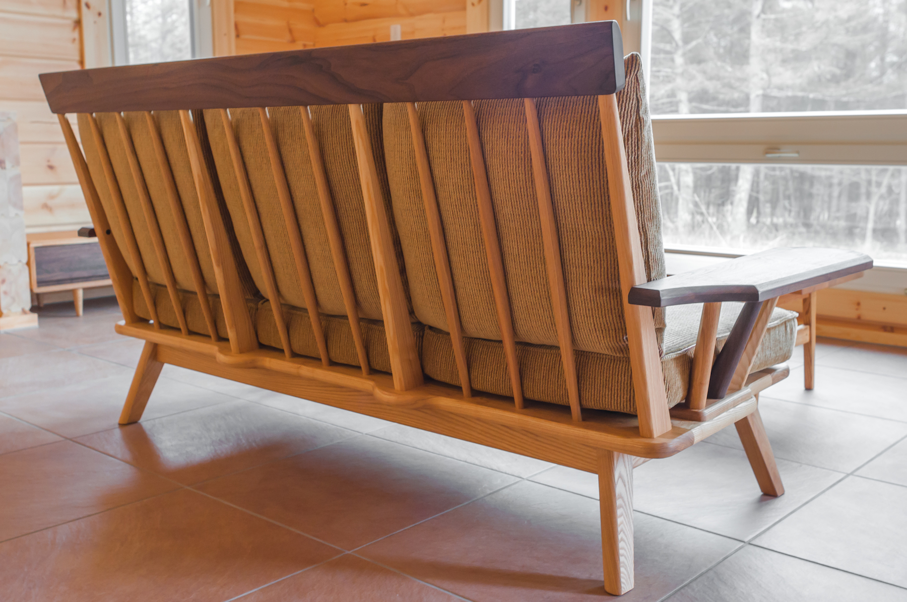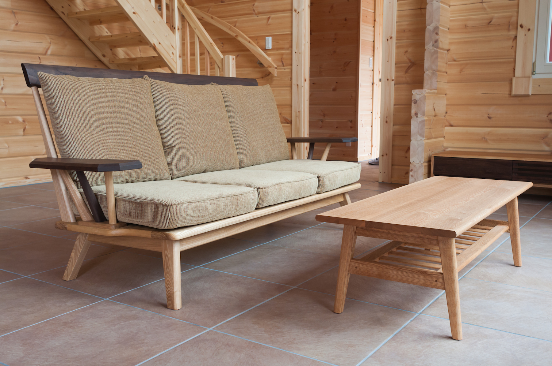TVボードと同じタモ(アッシュ)×ブラックウォールナット無垢材を使用したソファと、センターテーブルです。
