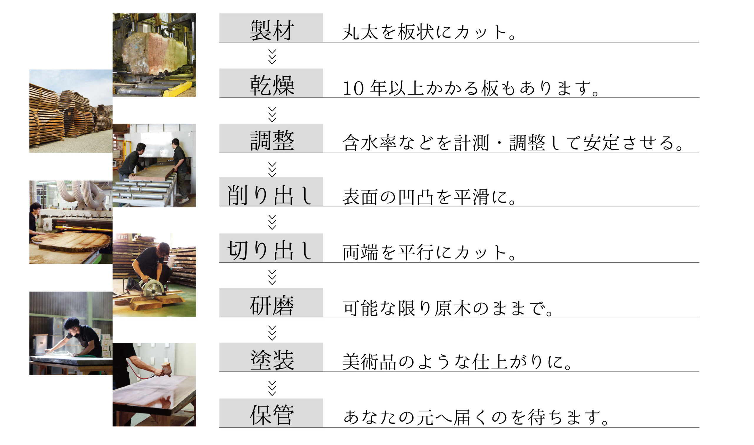 乾燥から加工まで、すべて国内で行っています。一枚板にはある程度のヒビや反りが付き物ですが、乾燥や加工を適切に行わなかった一枚板は、最初の1年ほどのうちに製品として寿命を終えてしまうようなひどい割れや反りが生じる可能性があります。そのようなことがないように、私たちは適切な処理を行った板だけを取り扱っています。