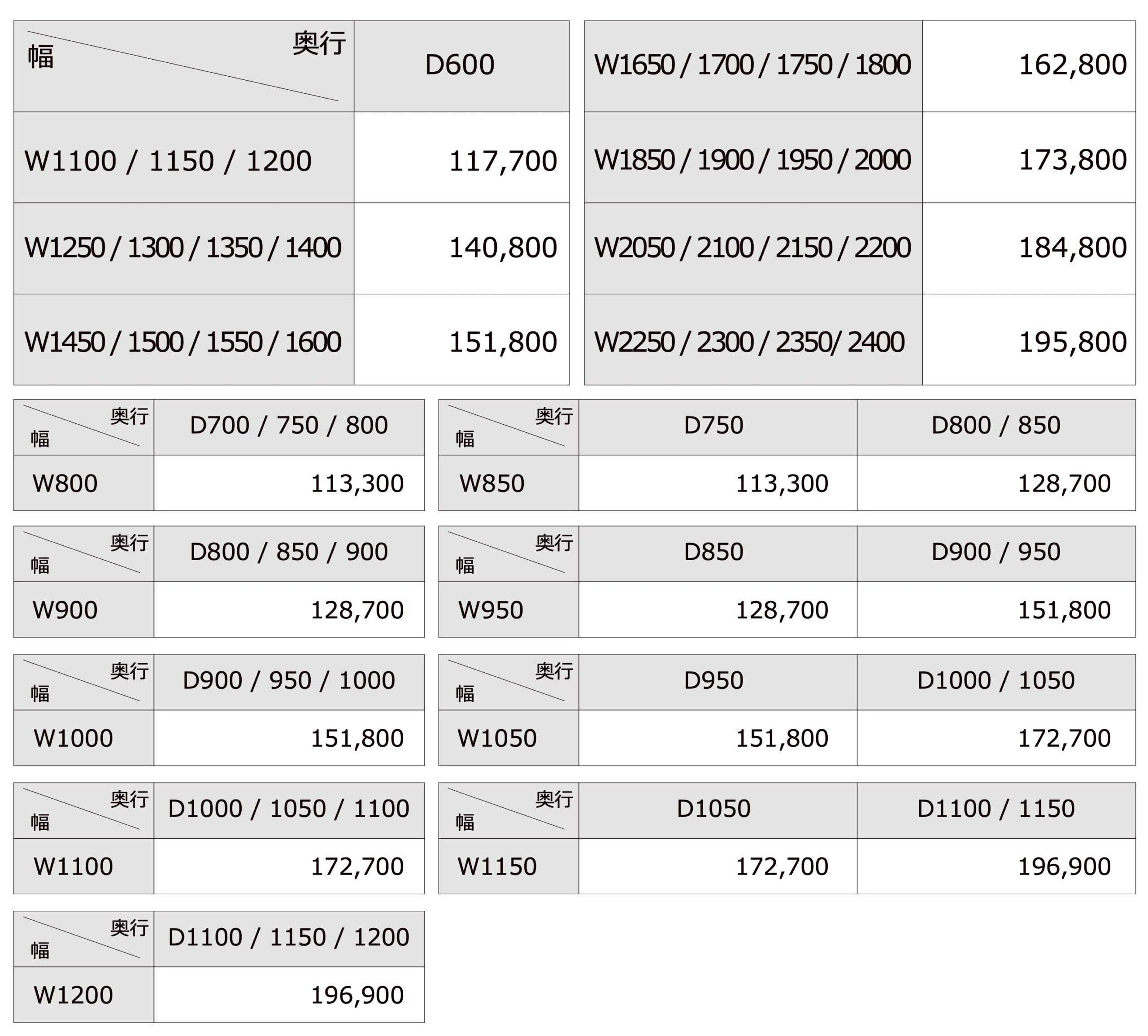 ※すべてH400《+¥16,500(消費税込み)にて±200mm以内で制作可》