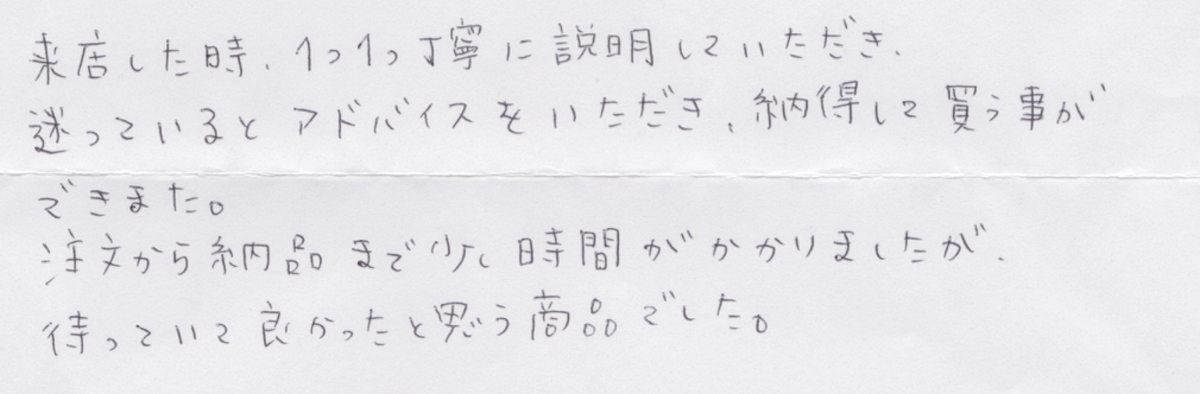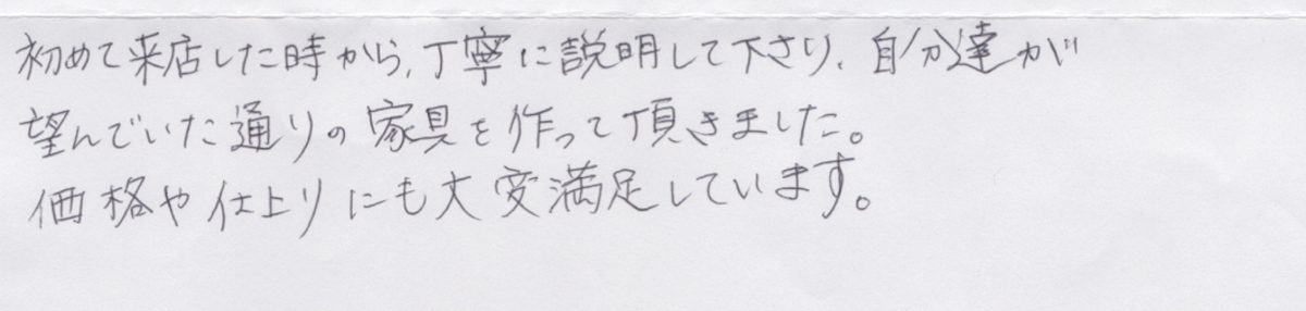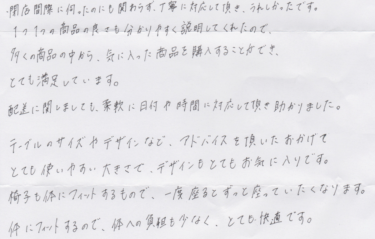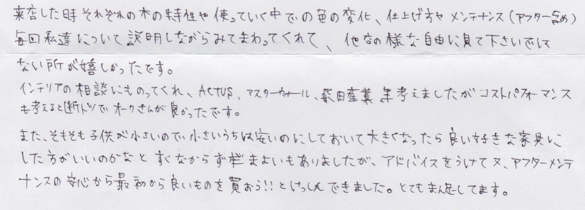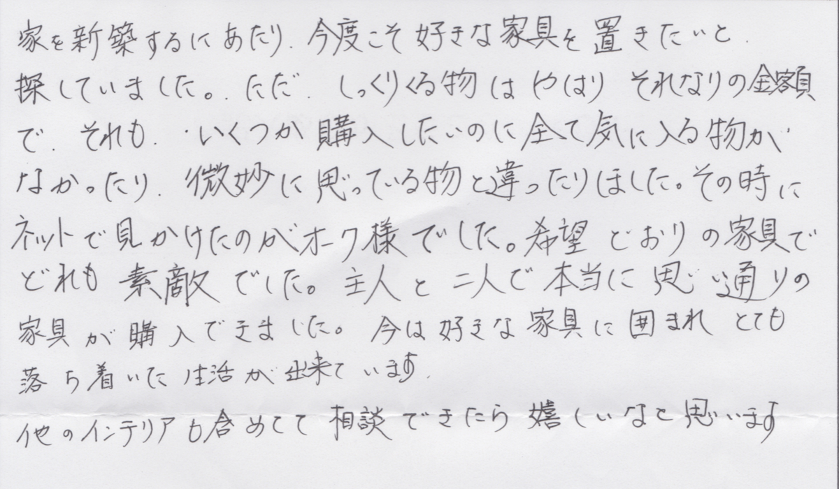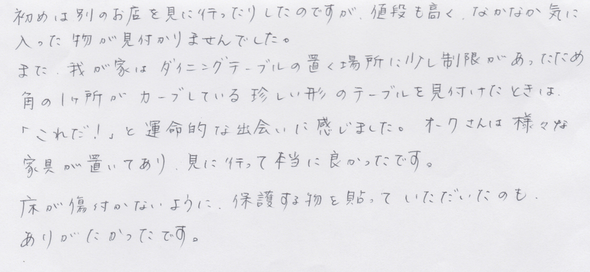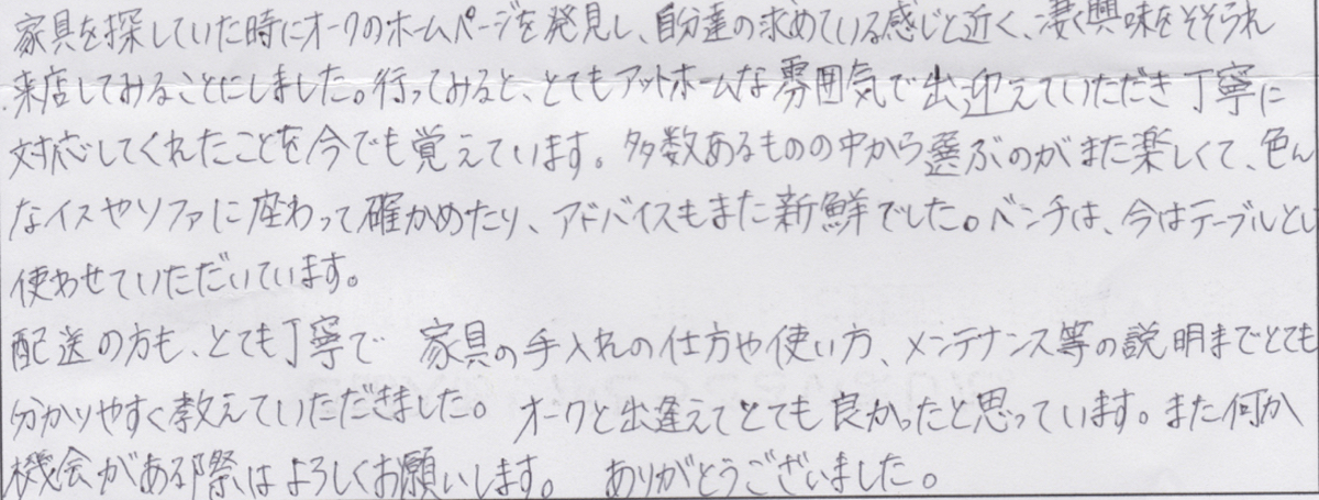 家具のオークでご購入いただいたお客様から、こんなお声を頂戴しています。声をお寄せいただいた皆様に感謝しながら、私たちはこれからも頑張って参ります。